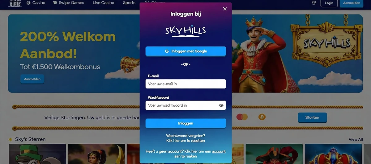 We kunnen direct inloggen op SkyHills Casino via elke mobiele webbrowser. Het inlogproces vereist onze geregistreerde e-mailadres en wachtwoord.